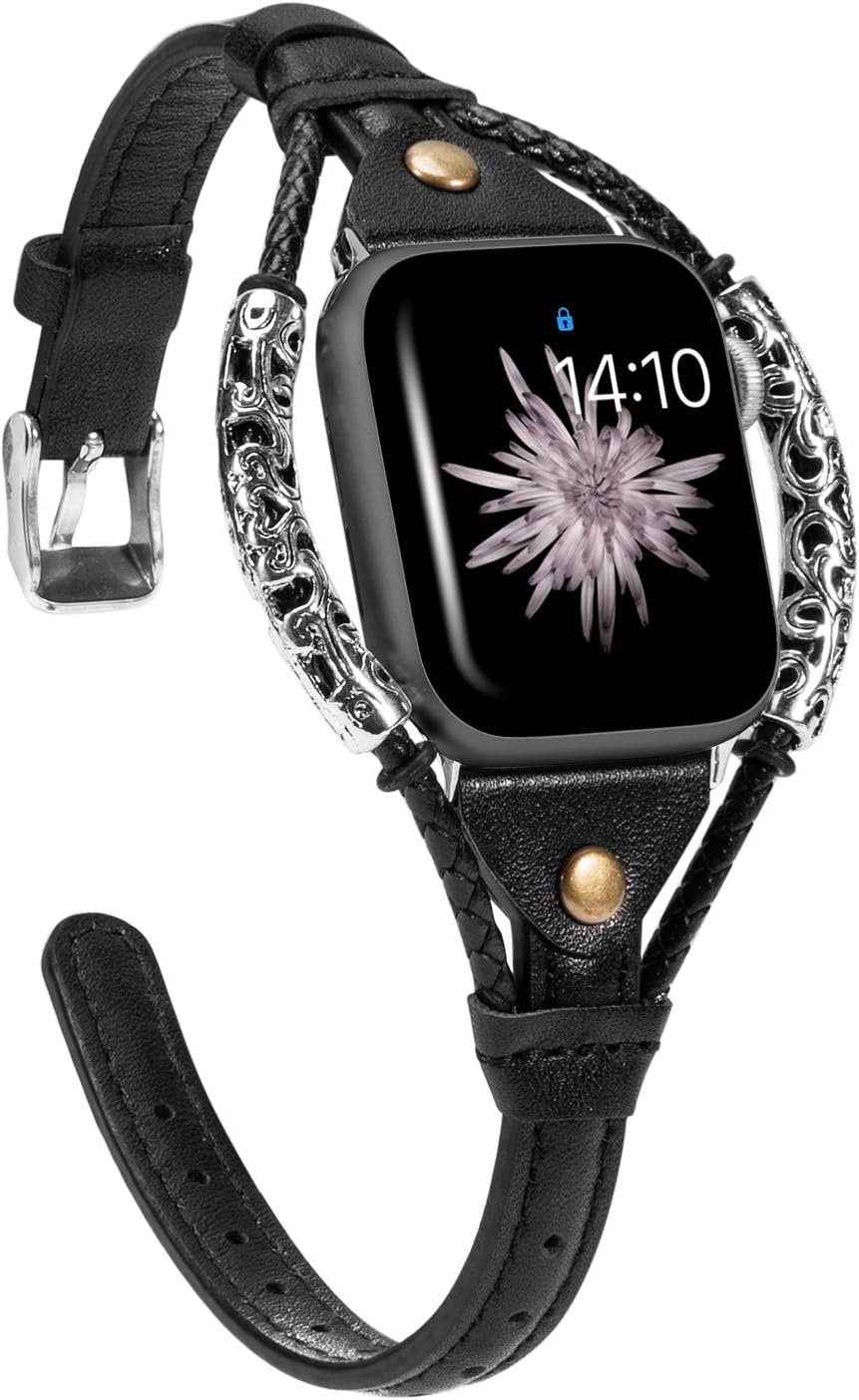 Amazon Com Wearlizer Black Leather Compatible With Apple Watch Bands 38mm 40mm For Iwatch Se Womens Handmade Twist Strip Strap With Bronze Rivet Rope Wristband Stylish Bracelet Silver Clasp Series 6 5 4